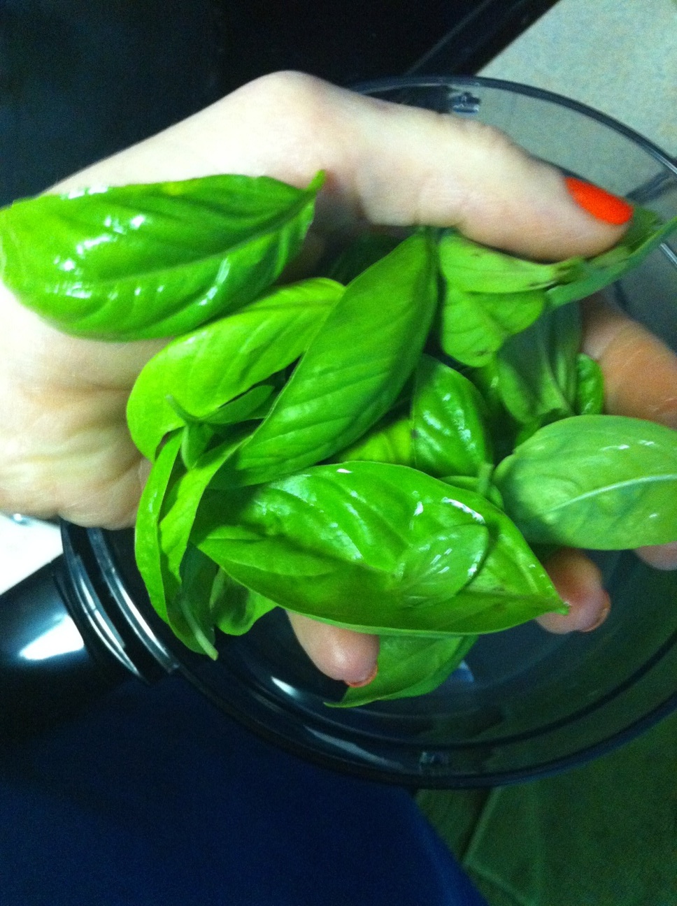 i started by adding a couple of handful of fresh basil leaves to my food processor with a clove of chopped up garlic.